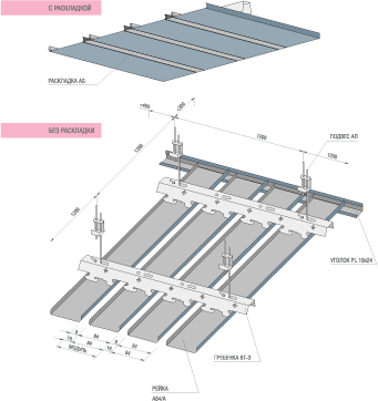 - Потолки выполняются с открытыми (дополнительно в стыки могут быть установлены декоративные раскладки) или с закрытыми стыками